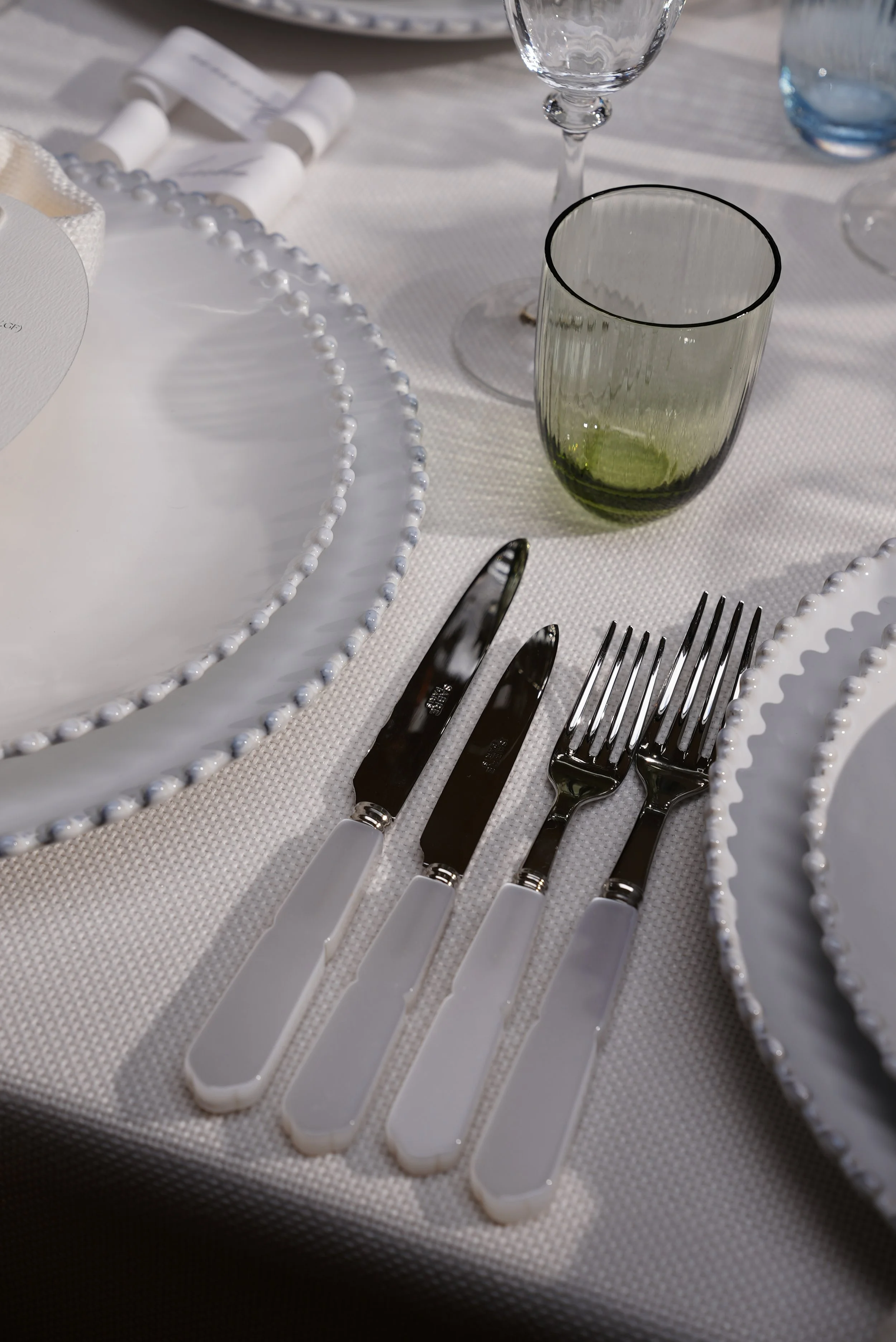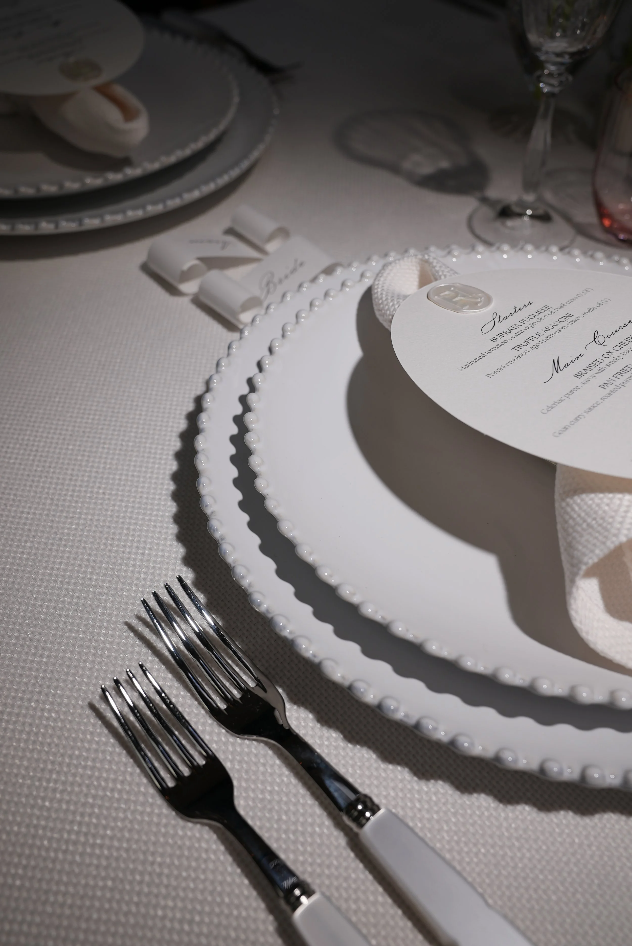 Ruffled napkins, cinched with octagonal glass rings, bring a tactile, sculptural finish to each setting. The overall look is timeless and romantic , effortlessly elegant with a celestial, dreamlike feel.
