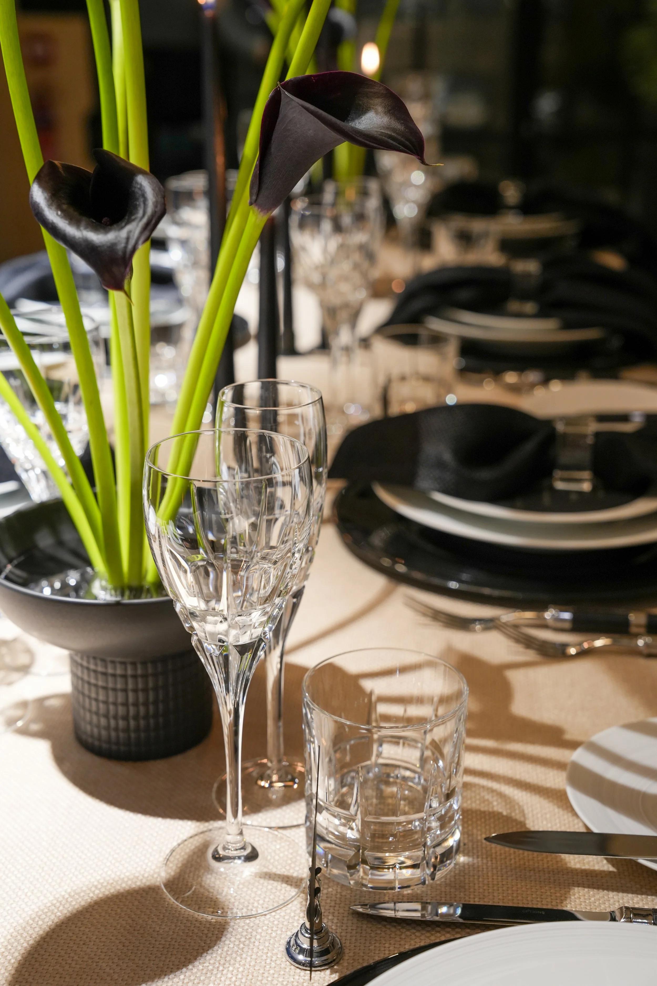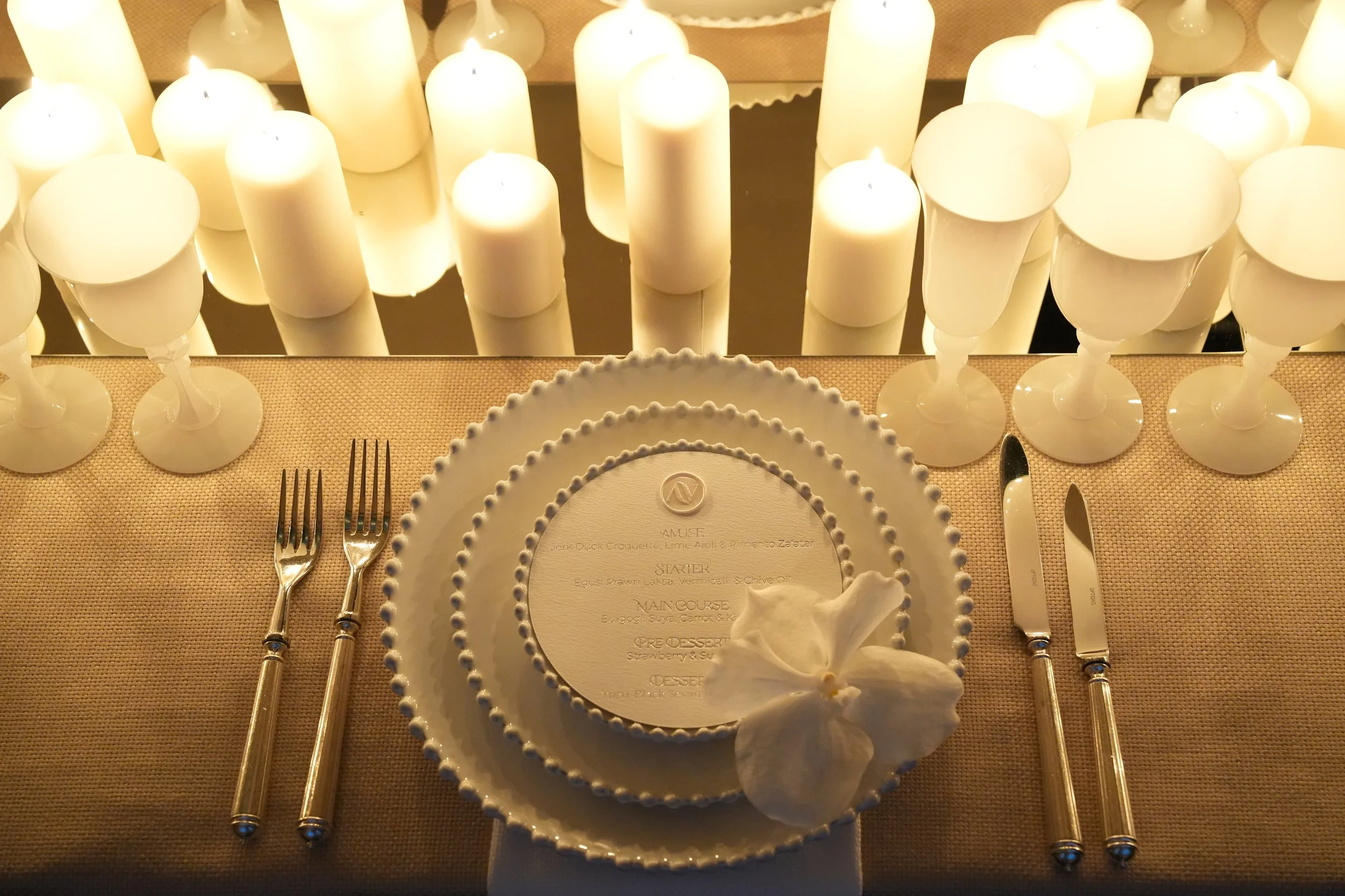 We created bespoke gold foil menus on white textured cardstock to create a gentle emboss. Custom sprayed candle holders adorned with matching alabaster taper candles of varying heights. Signature purple glass in line with Chef Dominique’s branding to add a personal touch. Shade the same as the embroidery on her Chef Jacket. Always accent with a clear glass for the feature drink, the most perfect topaz and white plate, adorned with gold cutlery to tie in the frame.