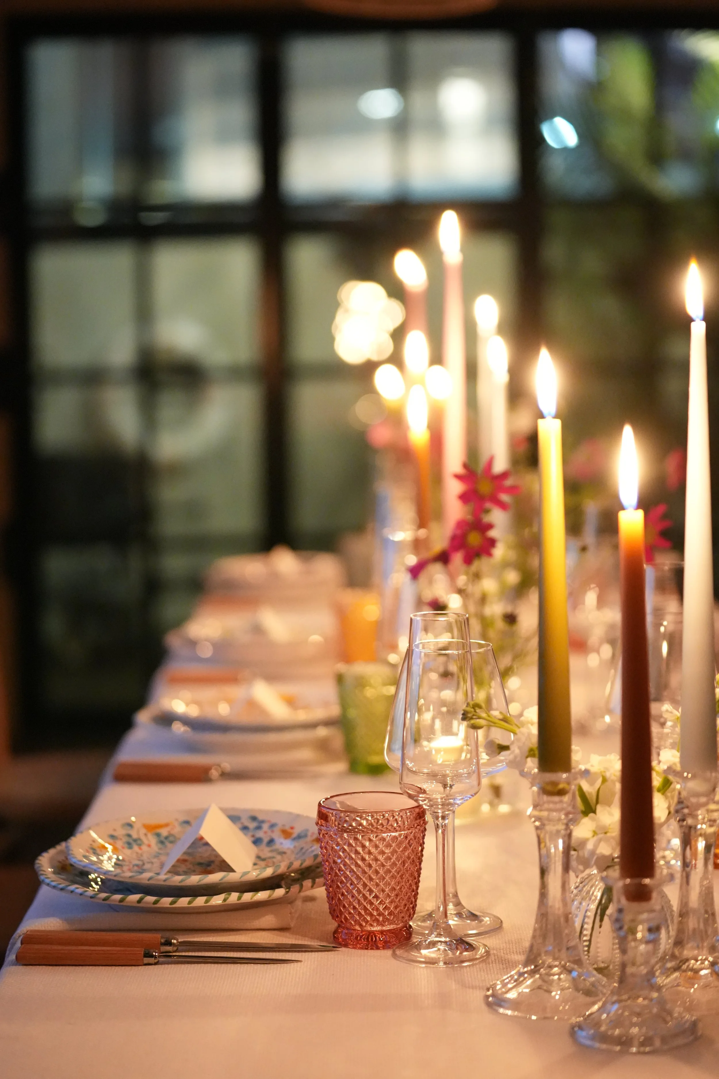 The brief was to create a warm, rustic yet sophisticated atmosphere for an intimate dinner. I chose a bare wooden table complemented by a natural linen runner and matching napkins. Grooved wooden cutlery paired with silver accents allowed the crystal stem glassware to shimmer in the candlelight. Digitally printed place cards adorned the wicker charger plates, enhancing the rustic vibe, each sealed with a bespoke olive green wax seal with the celebrants initials to complement the green stems of the white ranunculus.