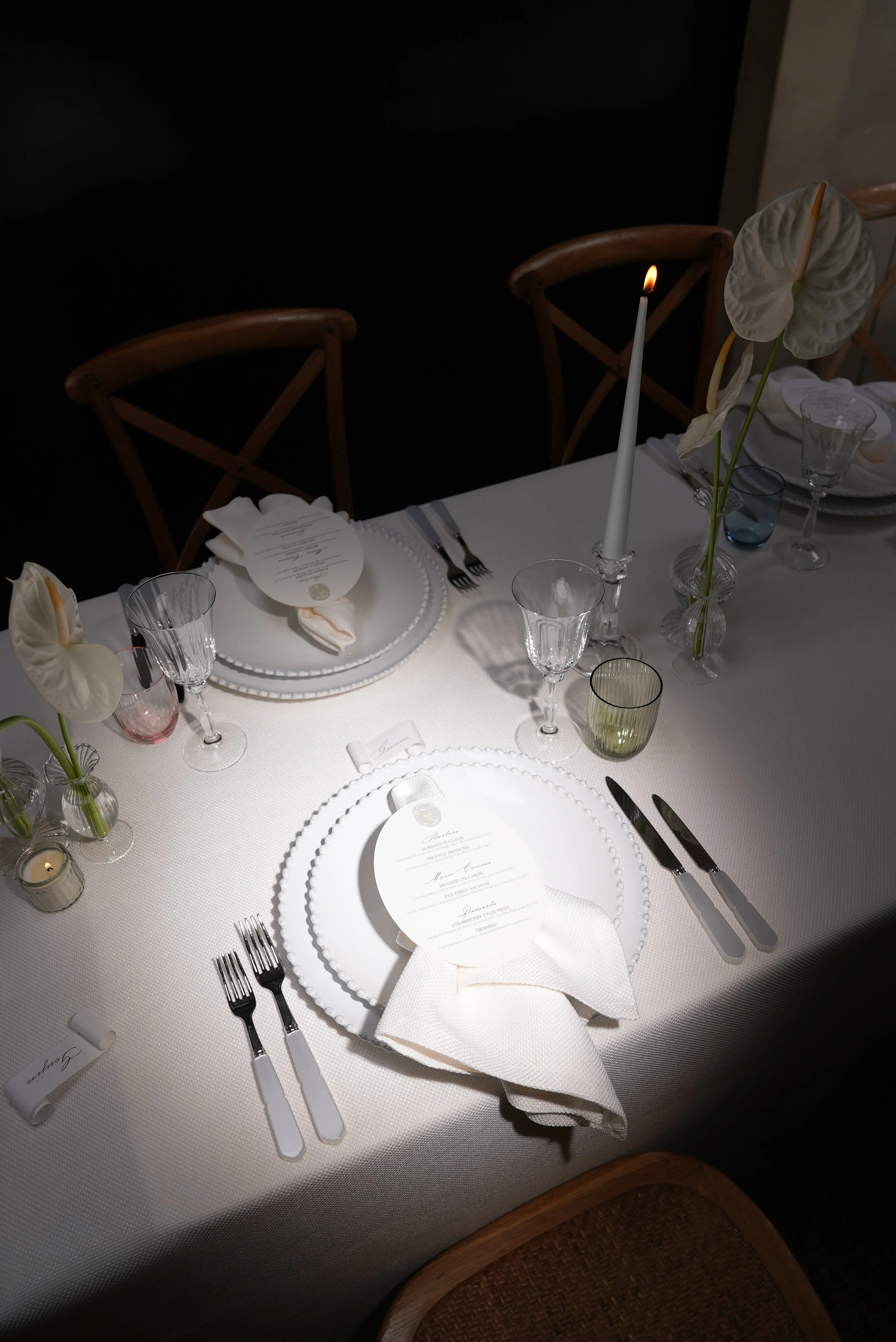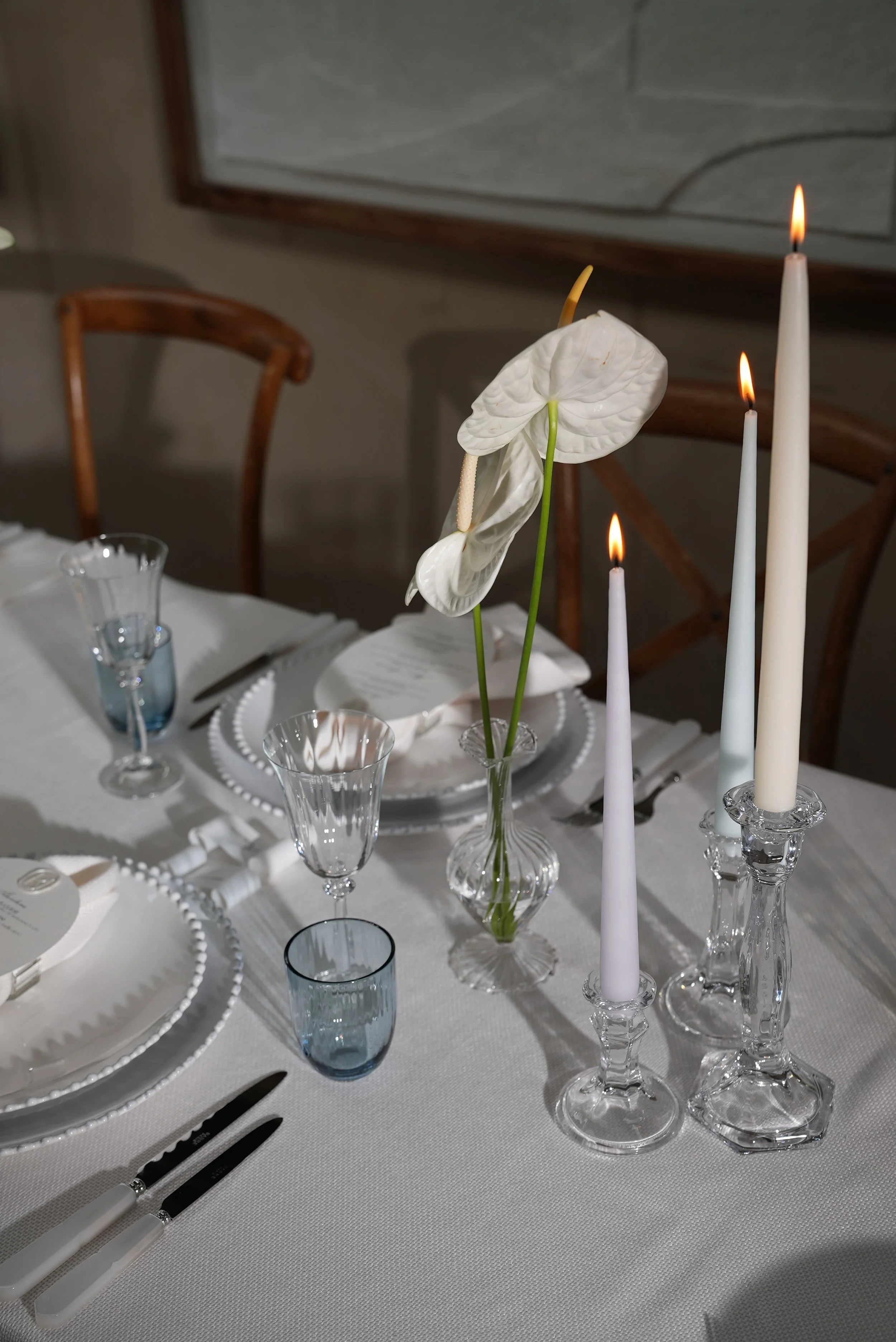 A vision of timeless romance and refined simplicity, this ethereal tablescape is anchored by all-white linens, offering a crisp, serene canvas. Pastel taper candles in varying heights cast a soft, flickering glow across the table, their light gently dancing among low-lying tealights and delicate bud vase arrangements. The florals, a sculptural mix of white calla lilies and anthuriums.